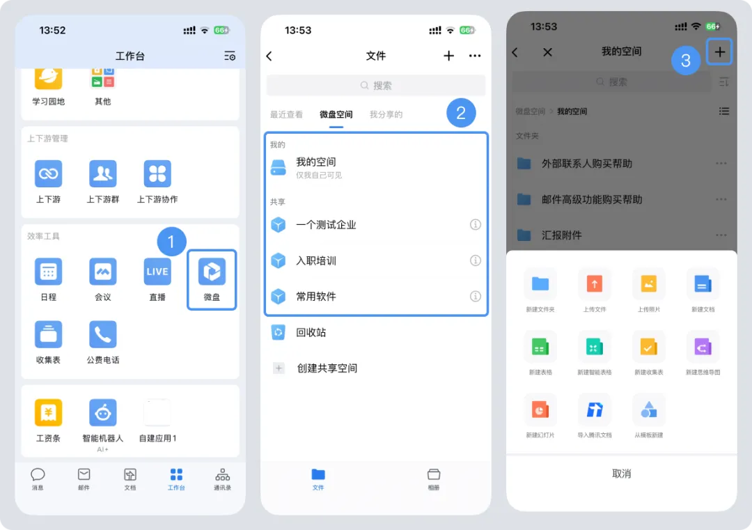【手机端->工作台->微盘->进入对应微盘空间->右上角+ 】