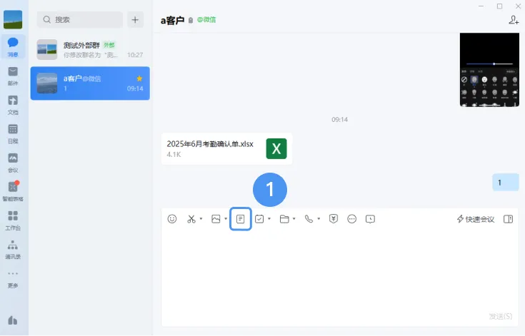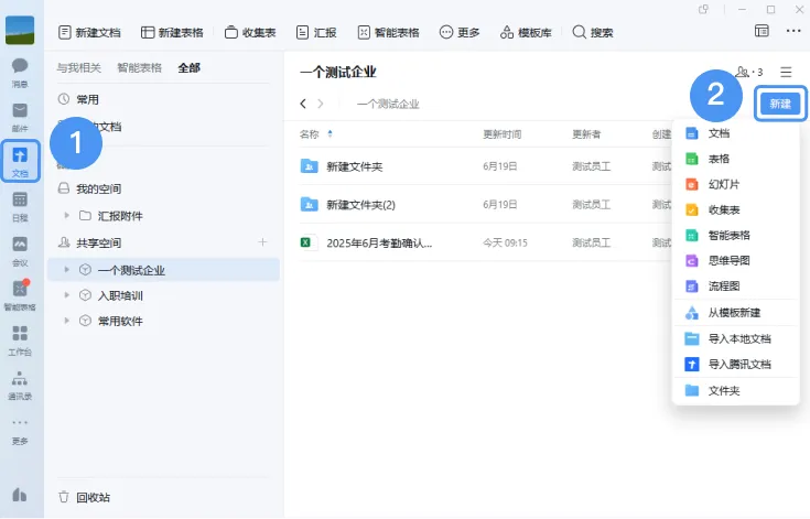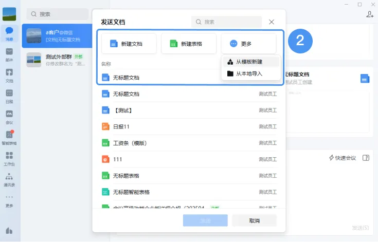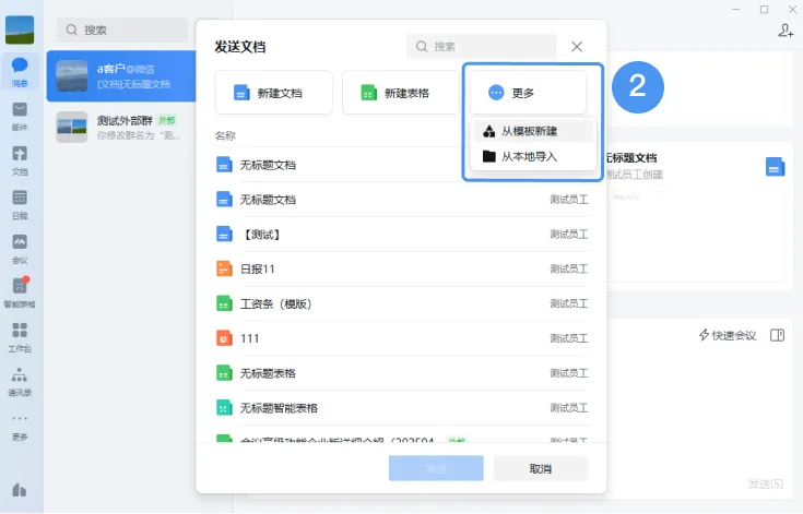 【会话页面->文档按钮->新建文档/表格】,点击“更多”还可选择从模板新建,选择对应模板发送到会话。