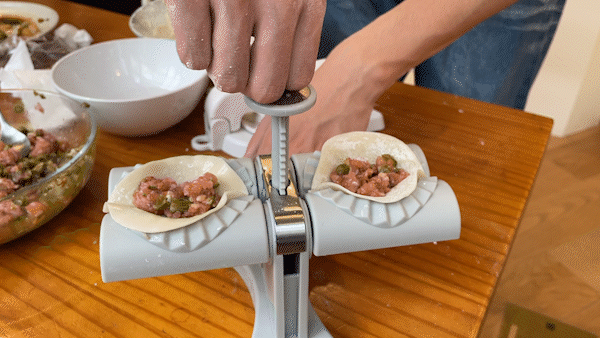 然而实际应用起来就会发现一个大bug:馅料不能放太多,否则会溢出来。(这是什么黑心饺子店专用神器……)