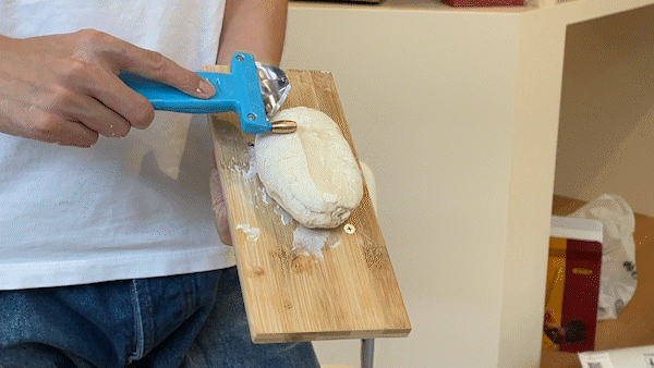 然后削面也不是那么容易上手,刀的着力点一定要在滚轮上,用滚轮的力带动刀片削出面条,一定不能靠刀片发力。