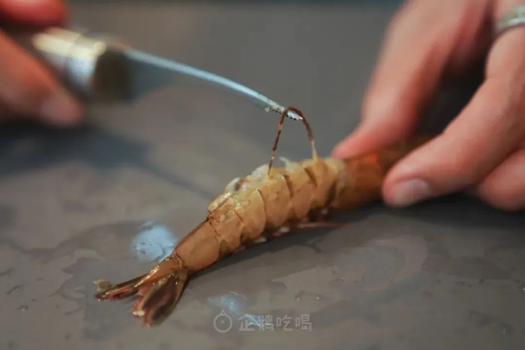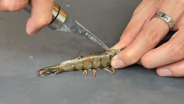 结果小刀轻松hold住,三下五除二就把虾壳划开了,轻轻一挑虾线也跟着出来了。