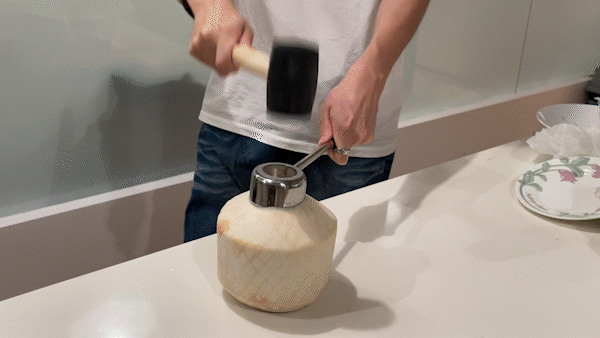 你只需要把圆形刀片卡在椰青顶部,用锤子敲几下就OK。