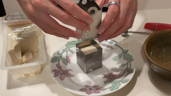 原理和操作都很简单,只需要用钢模取一块豆腐,推入网格分割刀,最后推出来就行了。