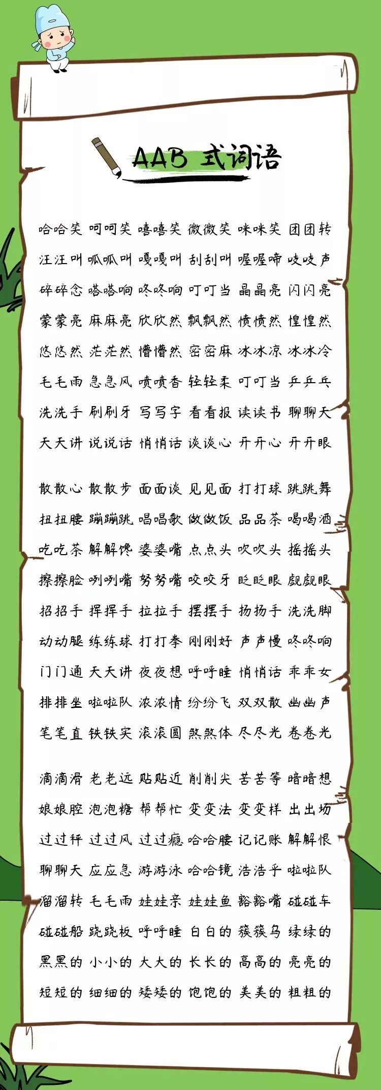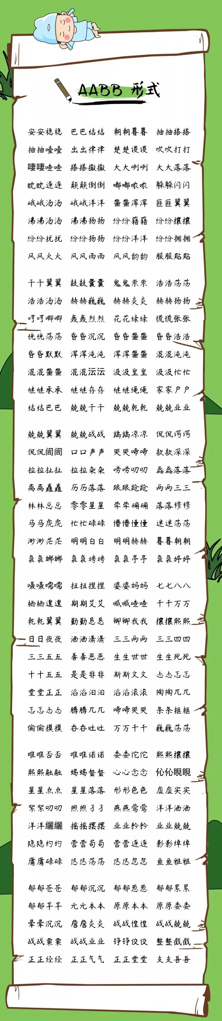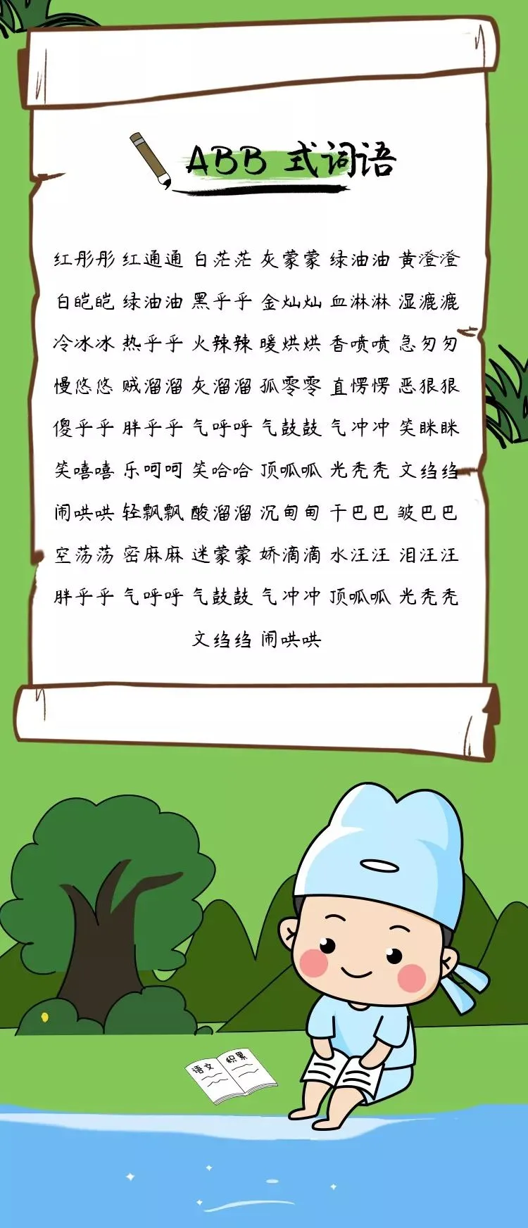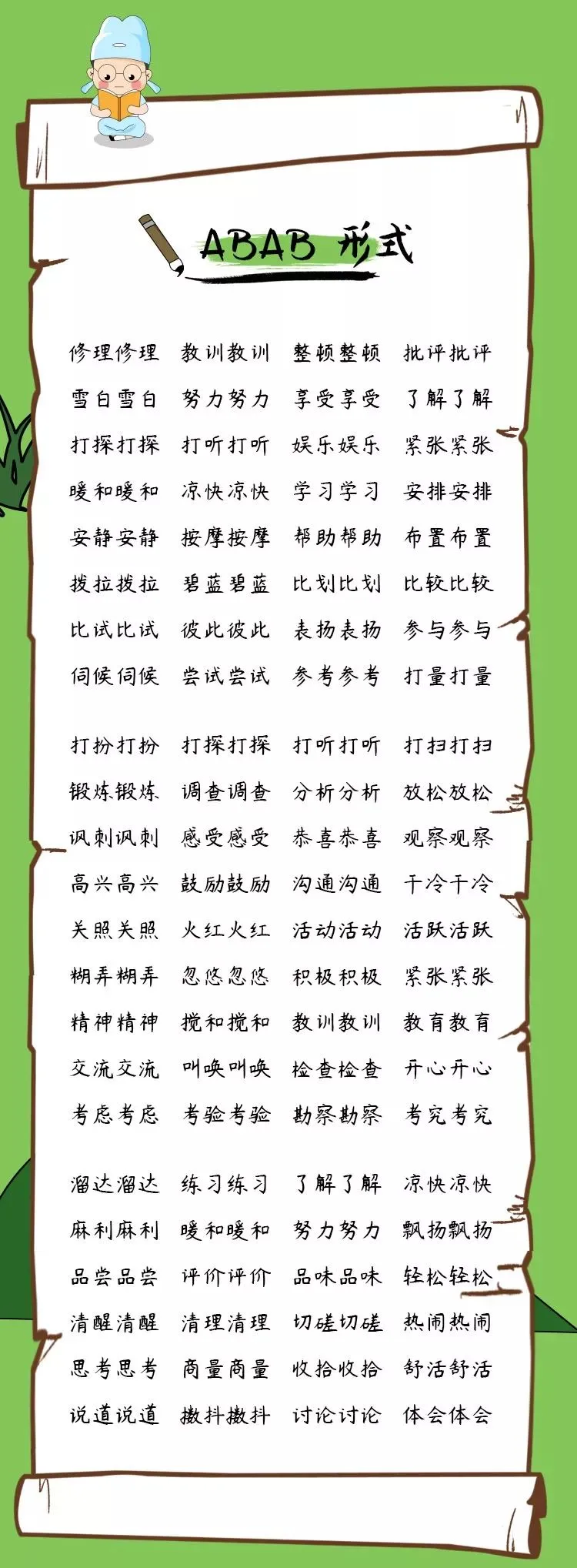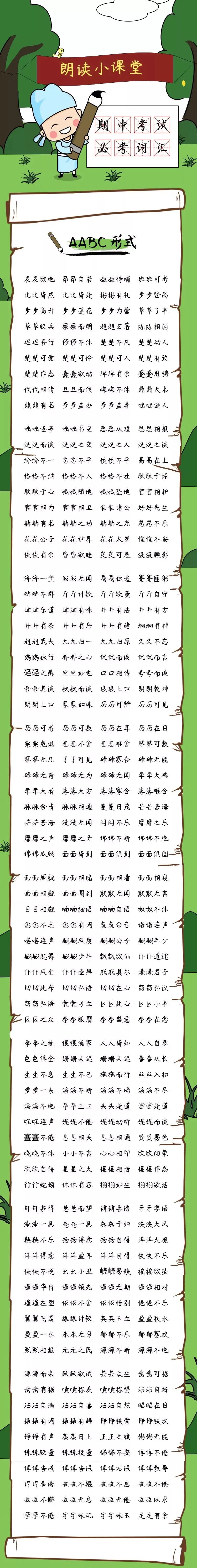 本站文章均为手工撰写未经允许谢绝转载:夜雨聆风 » 可打印丨期末必考成语汇总:AABC、ABCC、AABB、ABAB、ABAC、AAB、ABB七种形式-收藏!