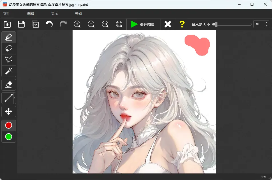 使用方法:打开inpaint,将需要去除水印的图片拖入软件中,将需要去除的地方涂抹一下,点击处理就能去除。