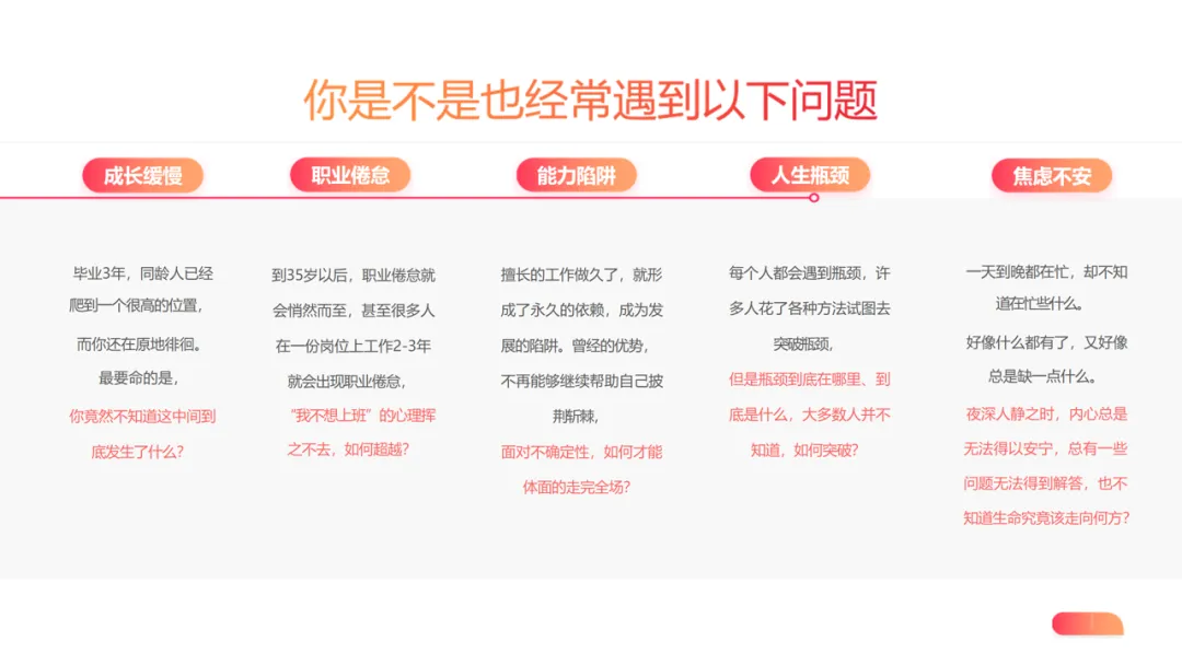 核心价值:针对成长缓慢、职业倦怠、能力陷阱等人生痛点,提供 “自我审视” 的工具方法,帮助个体突破瓶颈、减少焦虑,成为 “掌握命运的少数人”,这也是柳传志、达利欧等高手践行的核心学习方式。