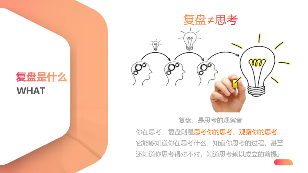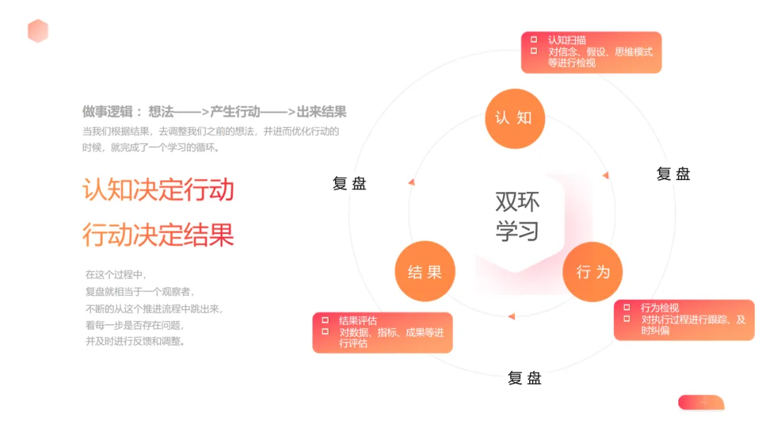 本质定义:复盘是 “思考的观察者”,通过反观事件过程、反思深层原因、反省起心动念,形成 “认知 – 行为 – 结果” 的闭环优化,区别于普通思考,核心是跳脱自我视角的高阶审视。