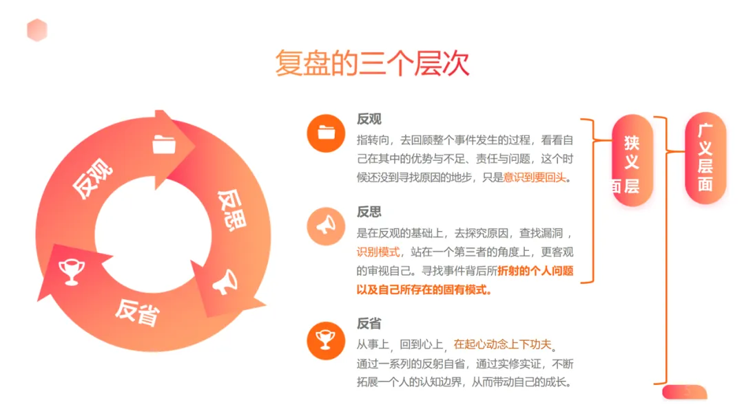三层维度:狭义层面是反观事件优劣,中观层面是反思问题模式,广义层面是反省认知信念,最终实现自我意识进化与能力升级。