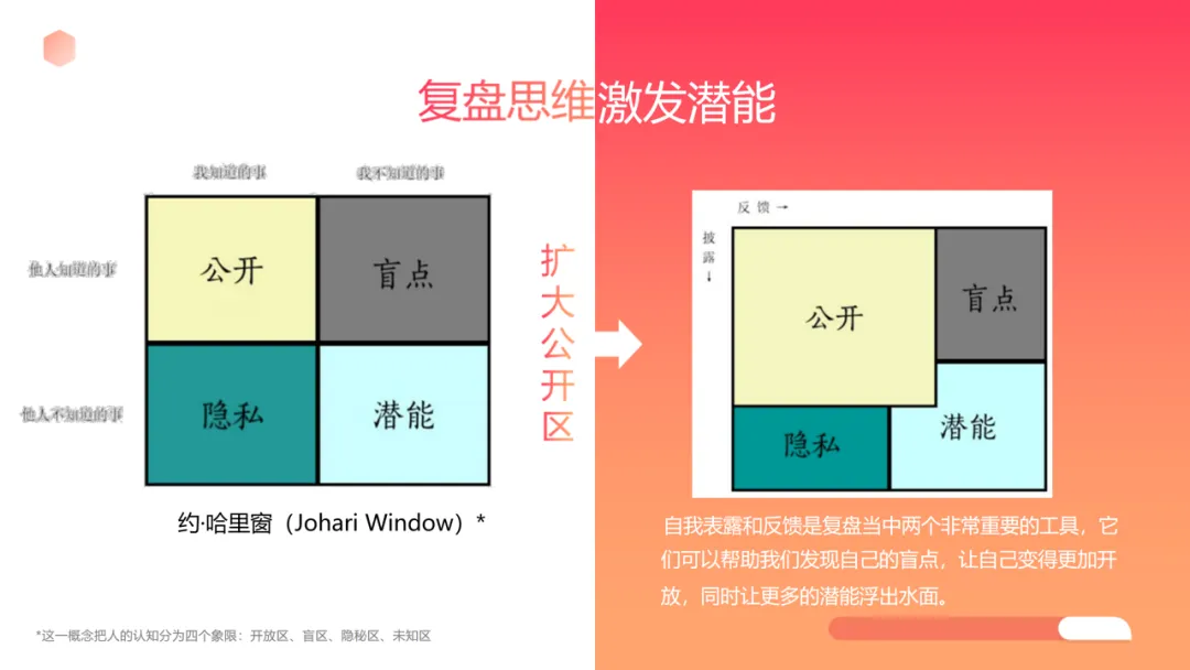工具支撑:借助约・哈里窗,通过自我表露与他人反馈,扩大公开区、减少盲点,激活潜在能力。