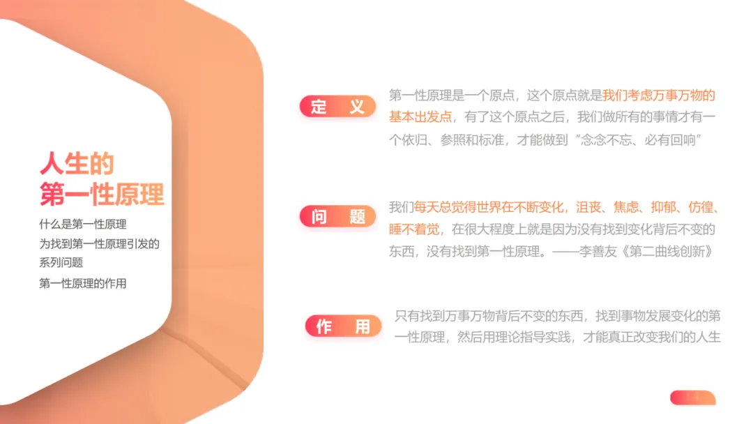 底层框架:以 “人生第二曲线” 与 “第一性原理” 为战略指引,强调在第一曲线衰退前启动新增长曲线,通过找到不变的核心原点(第一性原理),应对世界变化带来的焦虑与迷茫。