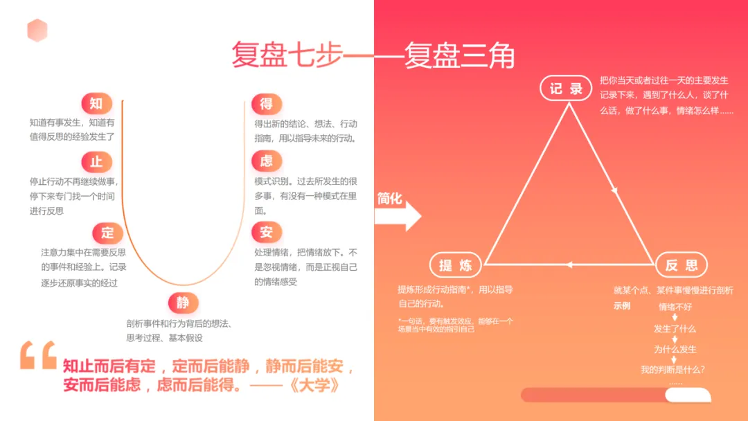 复盘七步与三角模型:遵循 “知 – 止 – 定 – 静 – 安 – 虑 – 得” 逻辑,通过记录事实、反思原因、提炼行动指南,完成闭环;