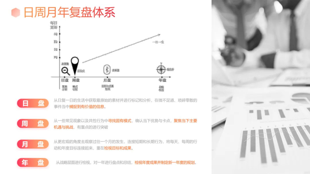 时间周期复盘:构建日周月年体系,日复盘培养 “盘感”、记录关键事件;周复盘识别行为模式、更新原则库;月复盘连接短期行动与长期目标;年复盘进行战略检视与规划。