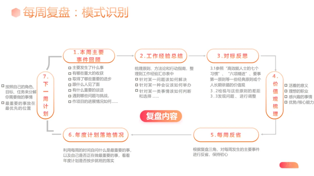 关键实践技巧:运用 “第一法则” 与 “第二象限法则” 锁定重要事项,避免瞎忙;通过对标复盘(书本、人物、经典)找差距、明方向。