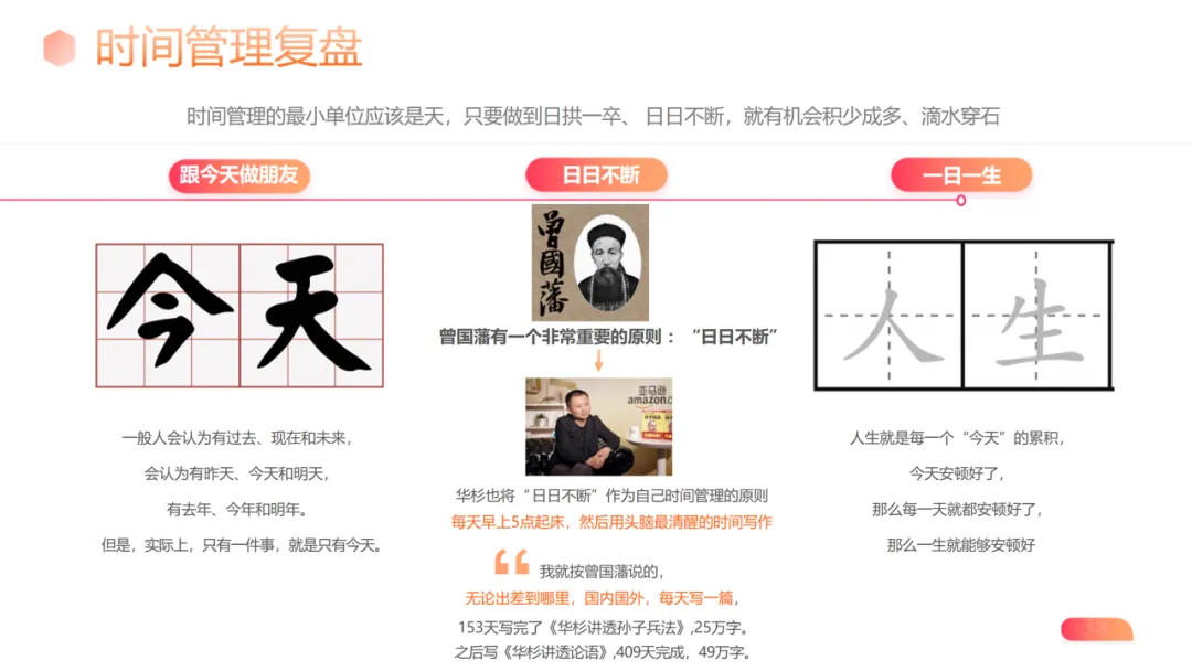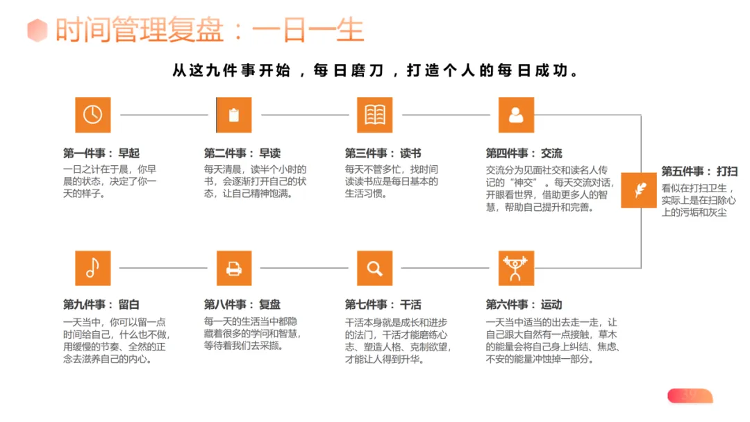 时间管理复盘:以 “日日不断” 为原则,通过早起、早读、运动等九件事,实现 “一日一生” 的精细化经营;