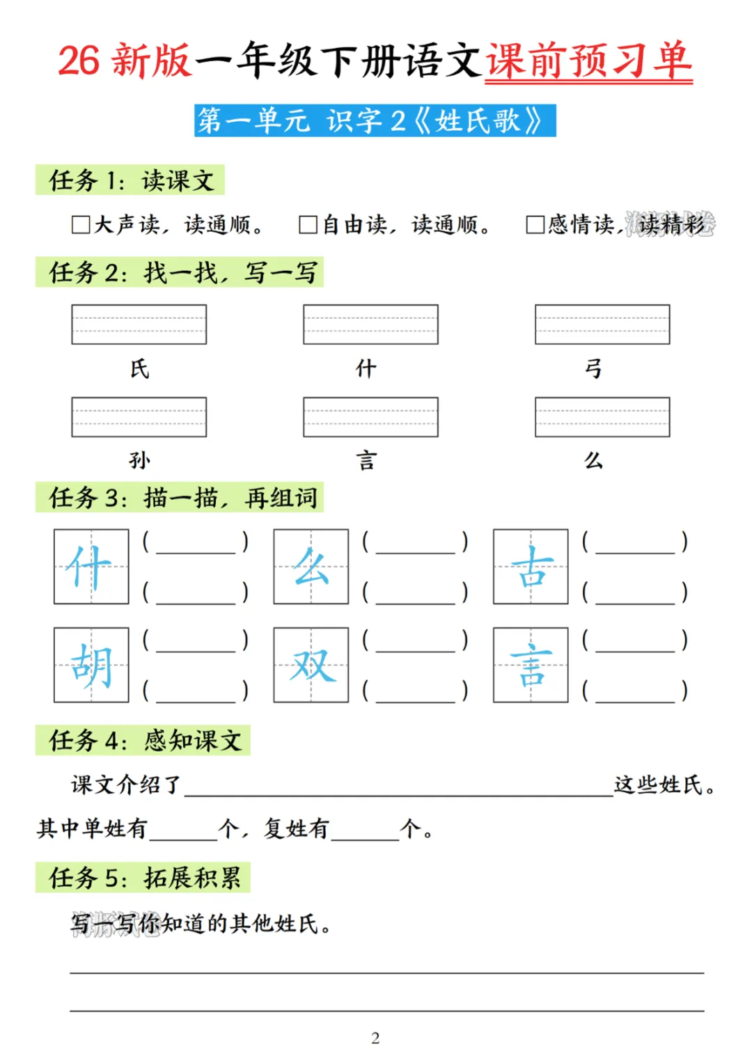 【免费下载】26新版一年级(下)语文课前预习单,PDF电子版,共36页,可打印