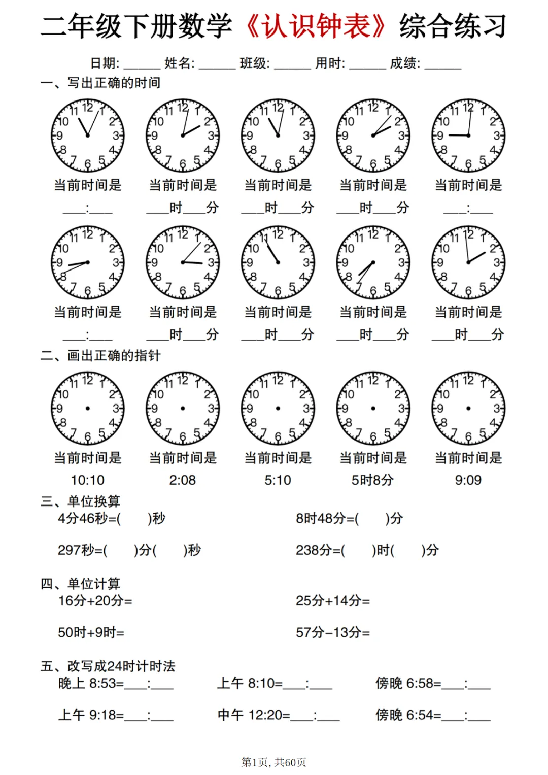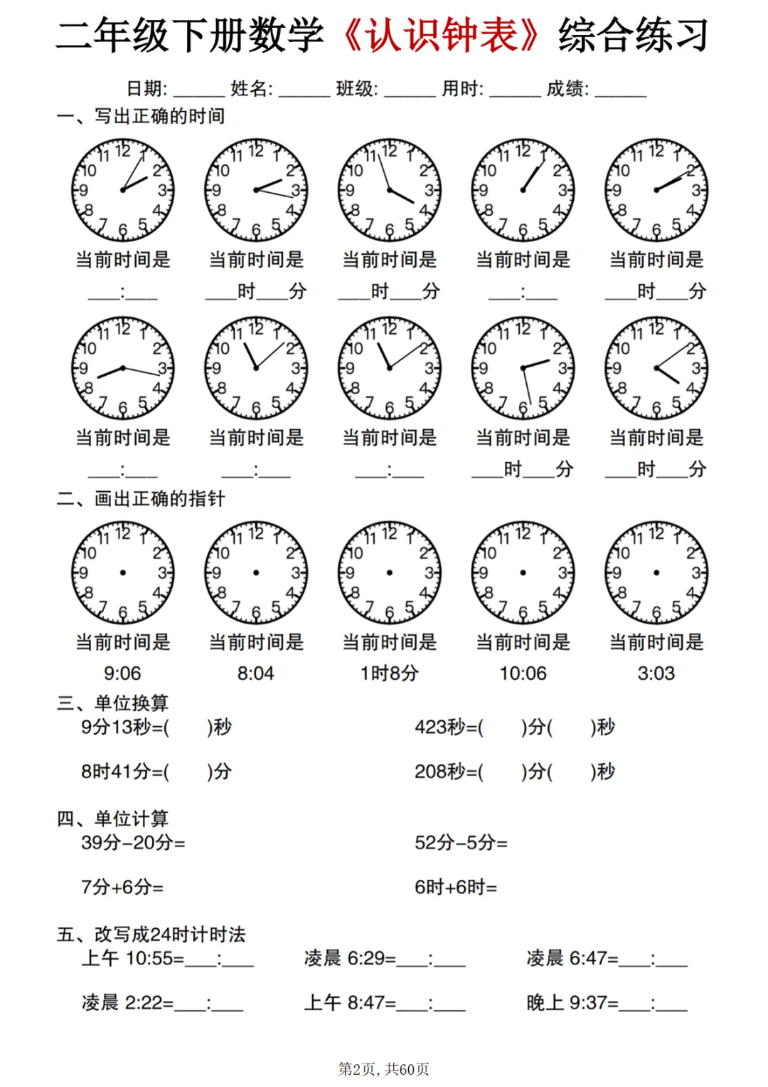 【免费下载】二年级(下)数学 《认识钟表》综合练习,PDF电子版,共60页,可打印