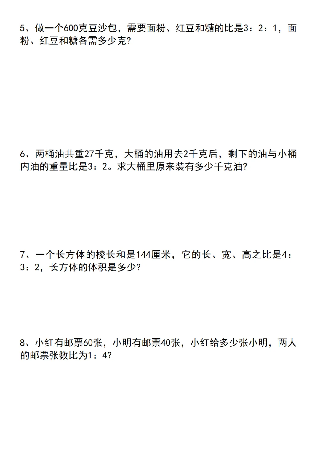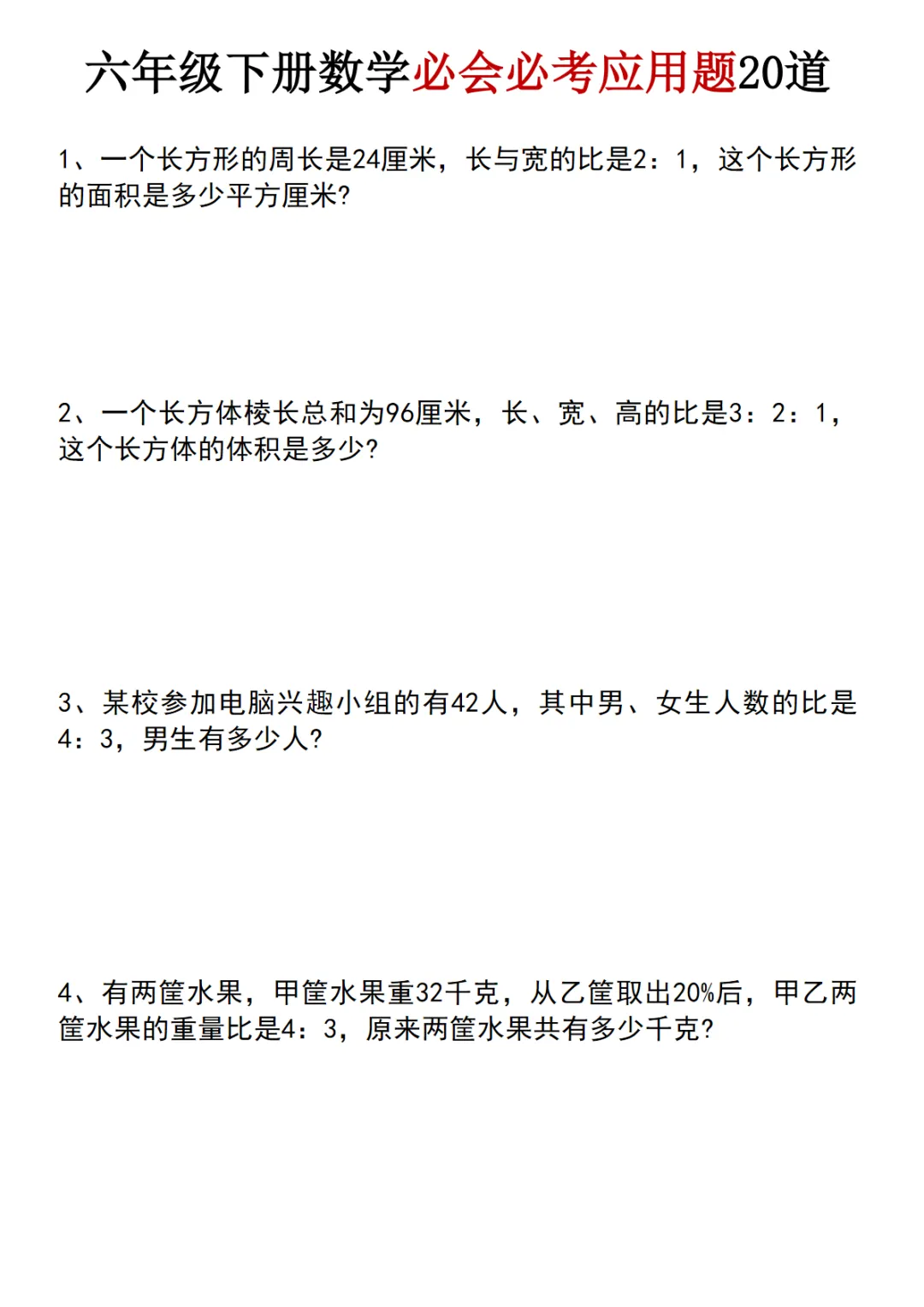 【免费下载】六年级(下)数学 小升初必会必考应用题20道,PDF电子版,共9页,可打印