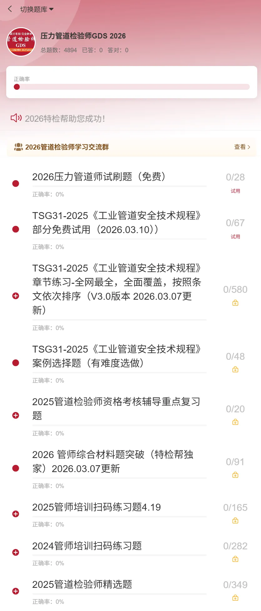 特检帮小程序题库迎来2026年3月最新版本(V3.0) 重磅更新!我们深知你的备考痛点,精心打造了 “四大模块” 学习体系。不管你是想刷历年真题,还是想攻克TSG 31-2025新规程,亦或是专项突击焊接工艺,这里全都有!