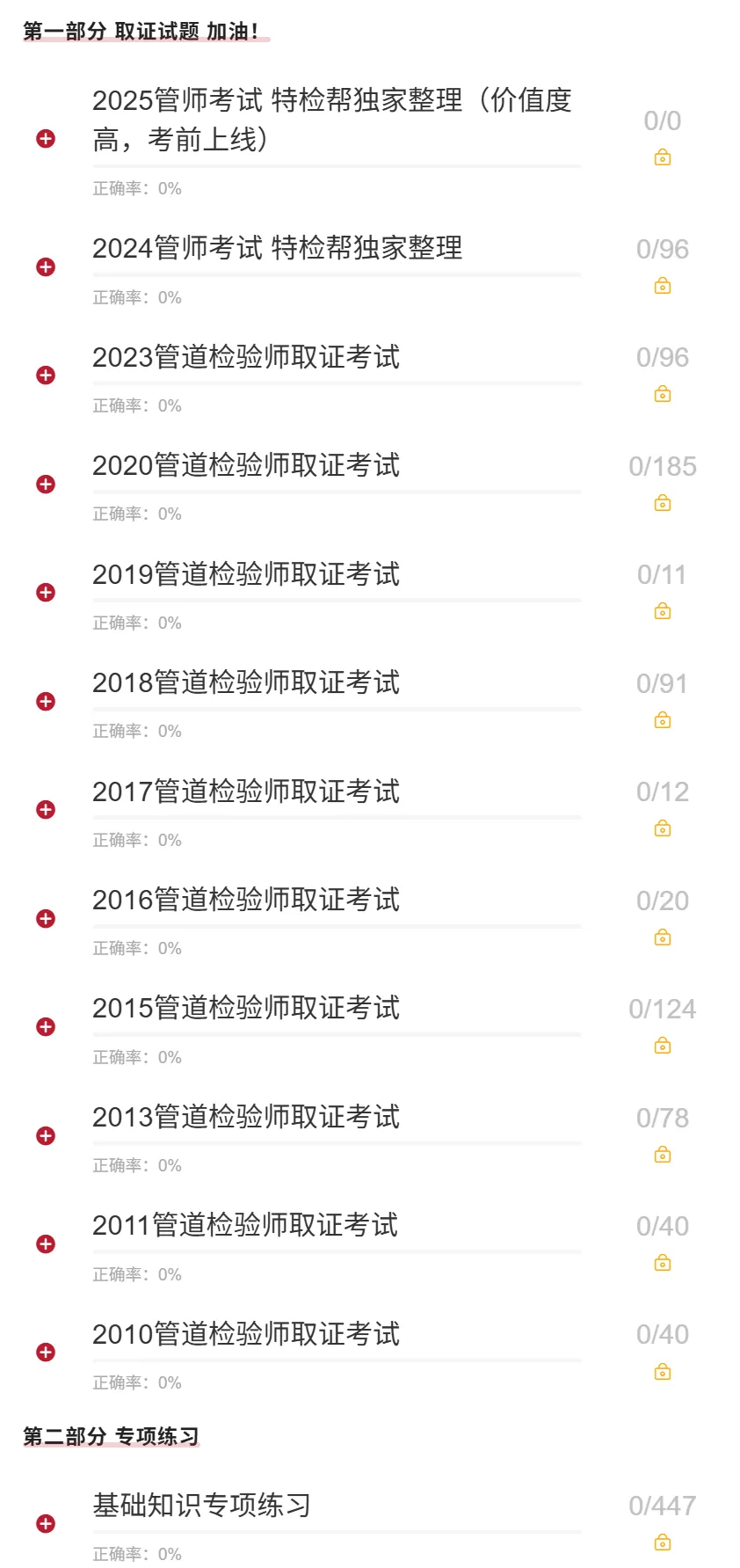 真题是备考最好的老师。特检帮深耕行业多年,整理了从2011年到2025年的管道检验师取证考试真题,是目前市面上最全的真题库之一。