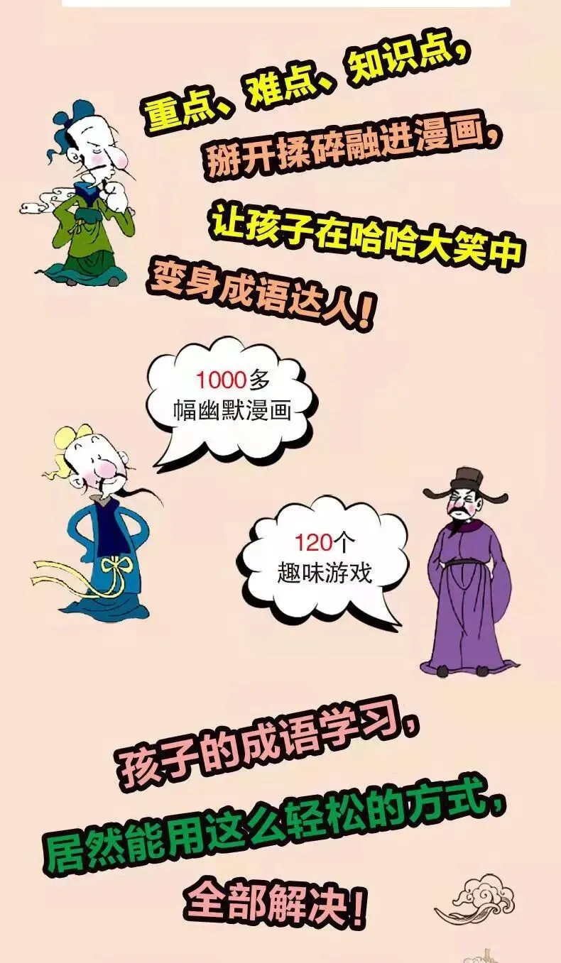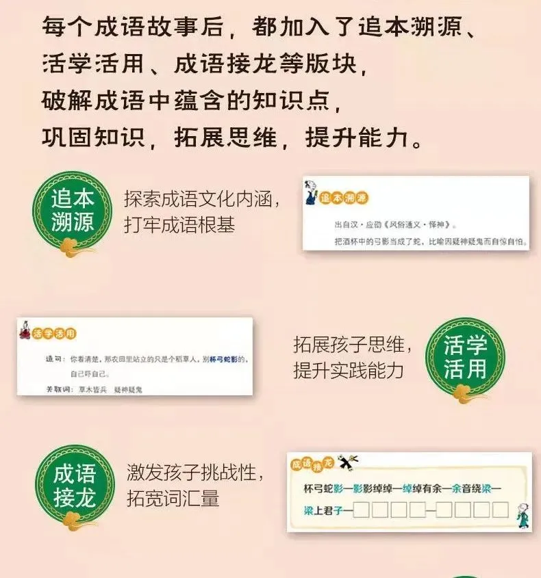 整套书共有200多个成语故事、1000多幅成语漫画、200多条成语接龙、5000+个成语,干货满满,不仅可以读故事,还可以看漫画、玩游戏、背接龙,一套书都可以拥有,非常全面。