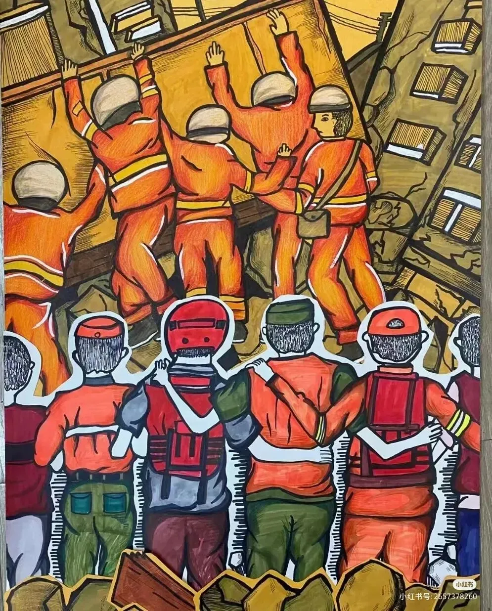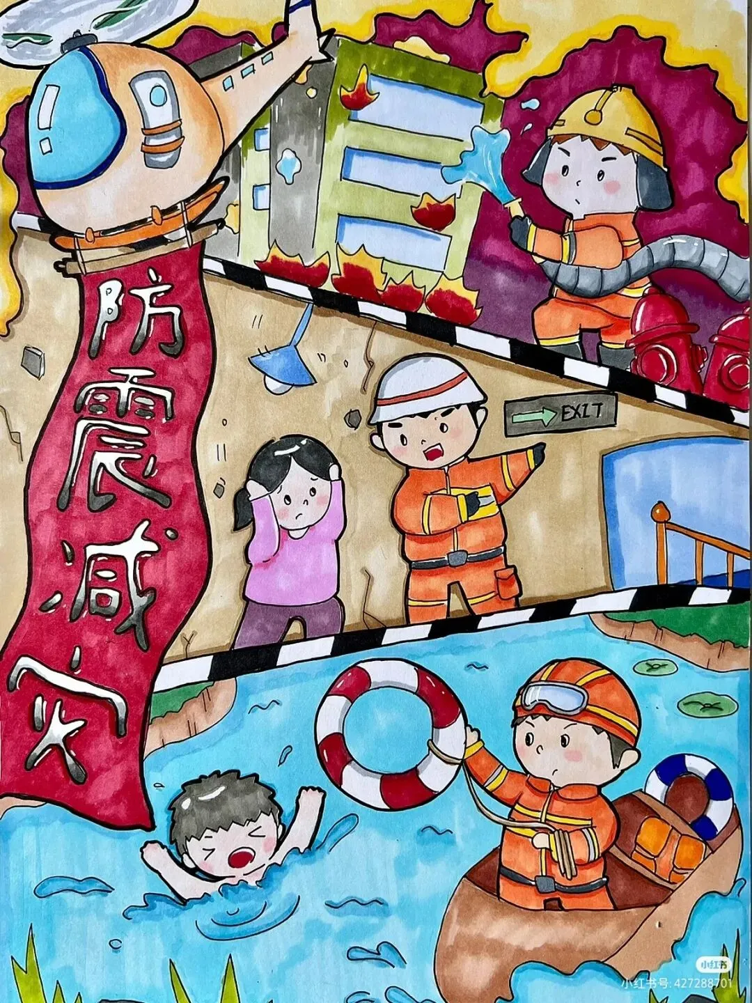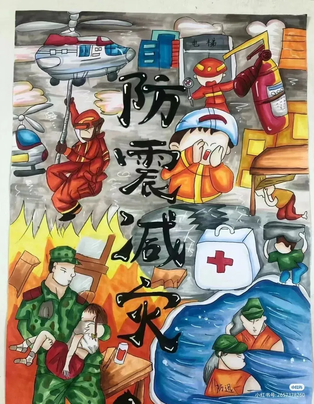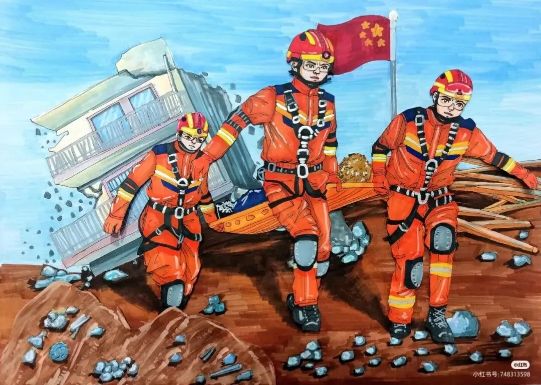 防震减灾主题绘画,以色彩与线条为语言,讲述着安全与希望的故事。画面中,我们可以看到坚固的建筑、有序的疏散路线、以及人们面对灾难时冷静而坚定的眼神。这些元素不仅展现了防震减灾的基本原则,如“安全第一,预防为主”,还通过视觉冲击力,激发人们对生命的尊重与对安全的重视。
