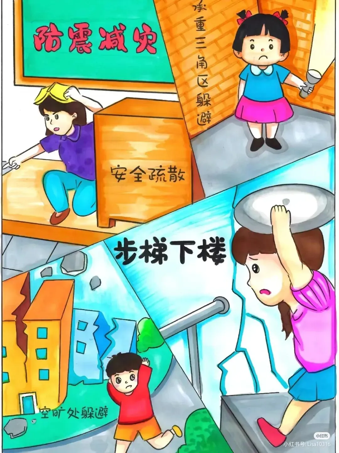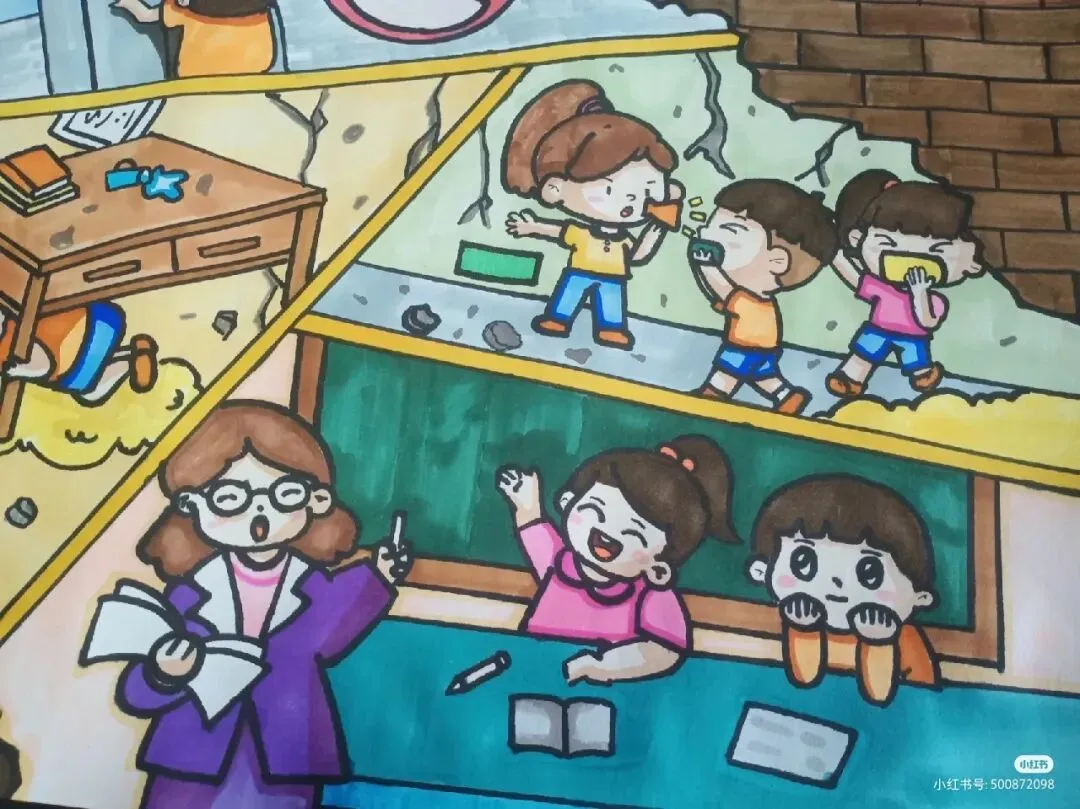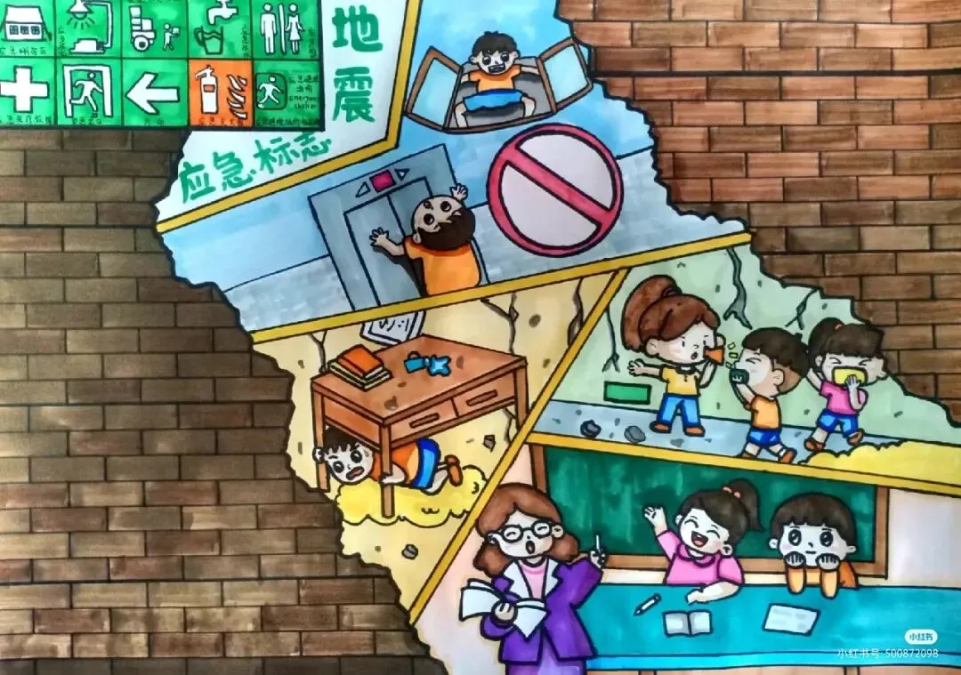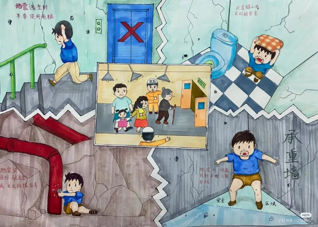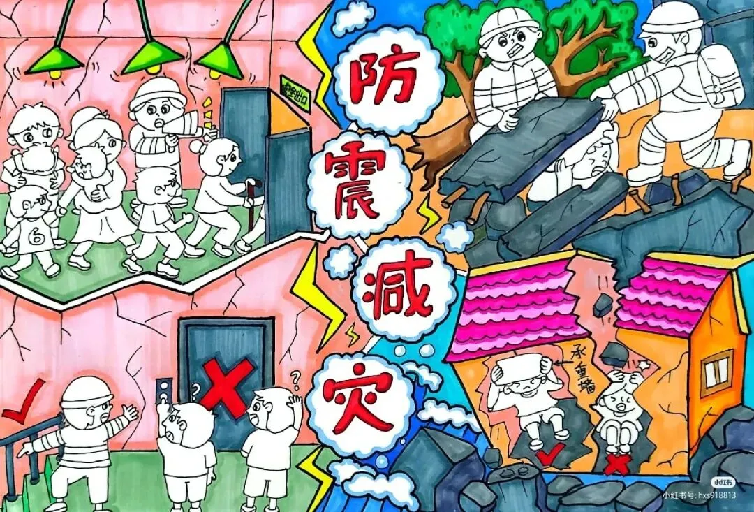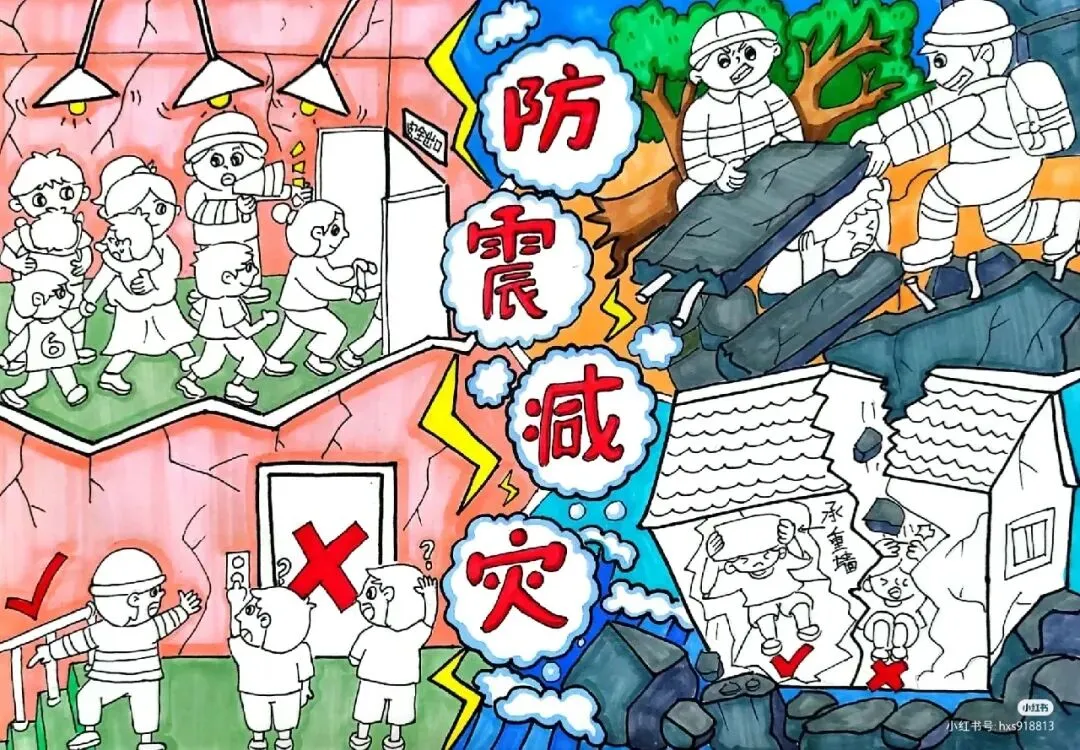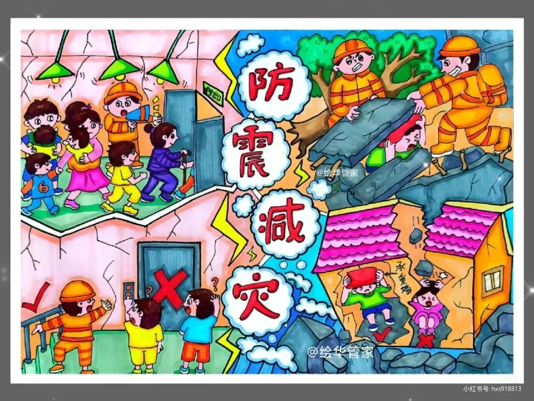 :绘画中可以融入抗震建筑的结构特点,如柔性连接、减震装置等,让观众直观理解抗震建筑如何减少地震破坏。 - 应急准备与演练