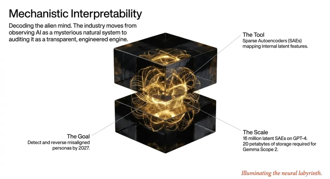 随着AI工厂化,理解这些黑盒内部的运行逻辑已成为全球安全与监管的底线要求。“机械解释性”(Mechanistic Interpretability)通过稀疏自编码器(SAEs)技术,正试图为复杂的神经网络提供类似大脑“MRI”的扫描。