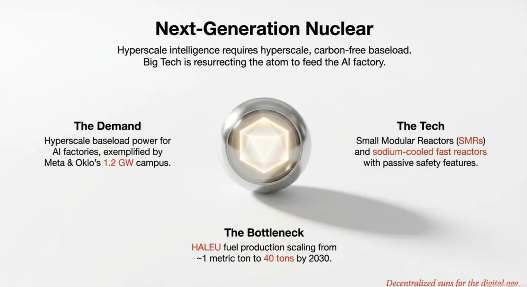 AI工厂对零排放稳定电力的极度渴求,迫使科技巨头直接介入能源基础设施。Meta与Oklo达成的1.2 GW核能园区协议,标志着“大科技”与“新核能”的深度绑定。