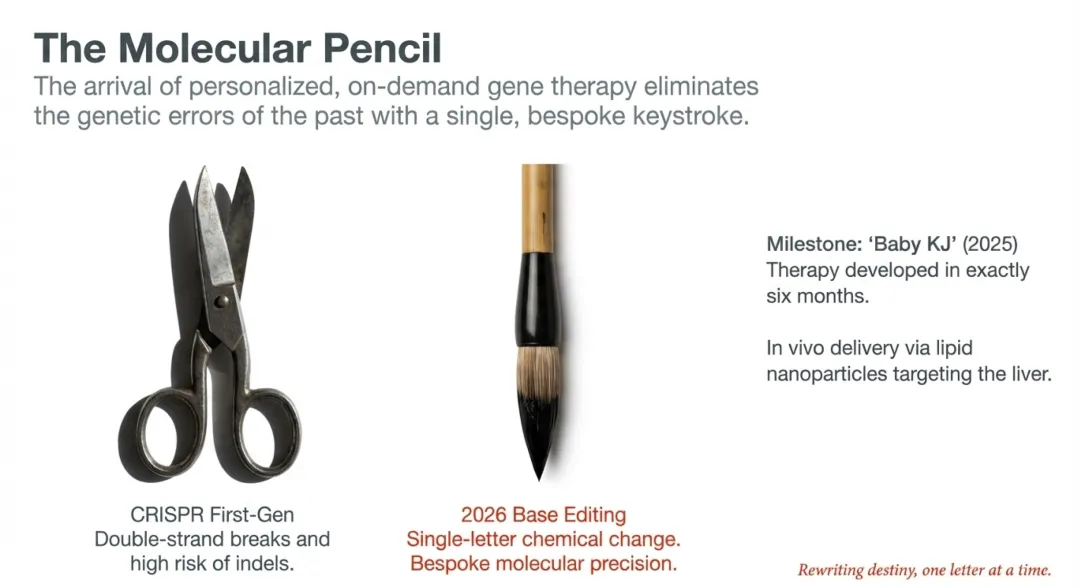 2025年,“Baby KJ”的案例改变了医学史。这名患有致命尿素循环障碍的婴儿,通过体内碱基编辑(Base Editing)获得了新生。