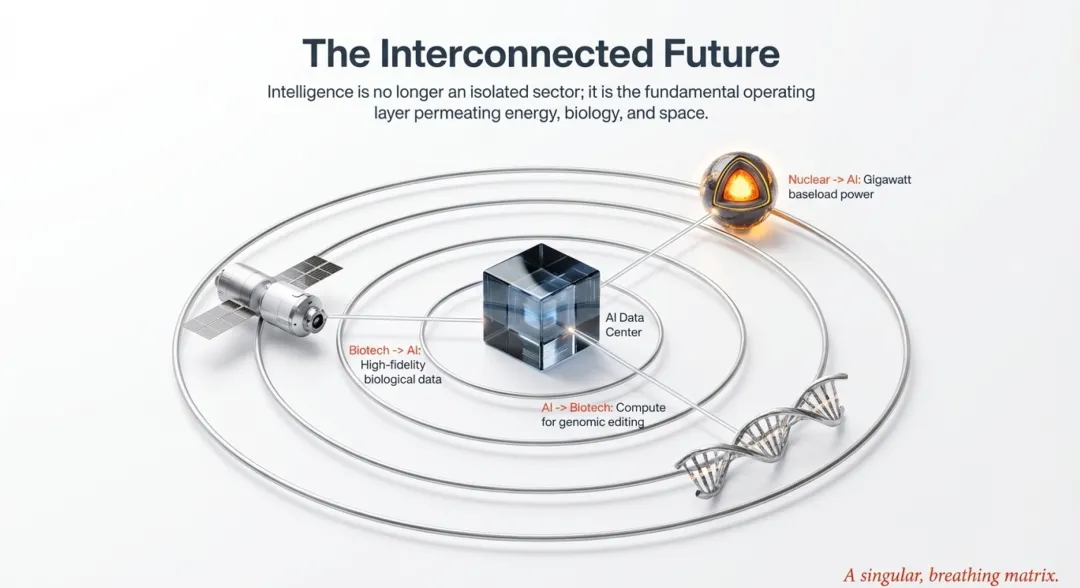 2026年的技术图谱展示了一个高度互构的系统:AI的进化需要吉瓦级核能,核能的稳定性依赖新型储能,而顶尖的基因修复则离不开AI工厂提供的巨大算力。