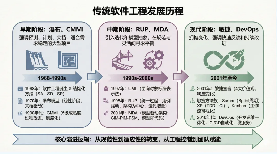 传统软件工程的发展我们可以分为三个阶段。早期的瀑布模型,包括CMMI软件成熟度模型的工程化;中期的RUP,MDA模型驱动架构;到现代阶段的敏捷,DevOps,微服务和领域建模。