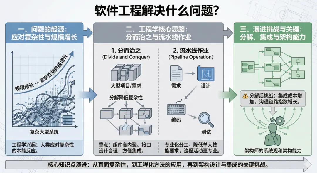 要回答这个问题,还是要回到软件工程究竟解决了什么问题谈起。简单来说软件工程就是为了应对软件复杂性和规模增长而兴起的工程学。在布鲁克斯经典的《人月神话》这本书里面就谈到。