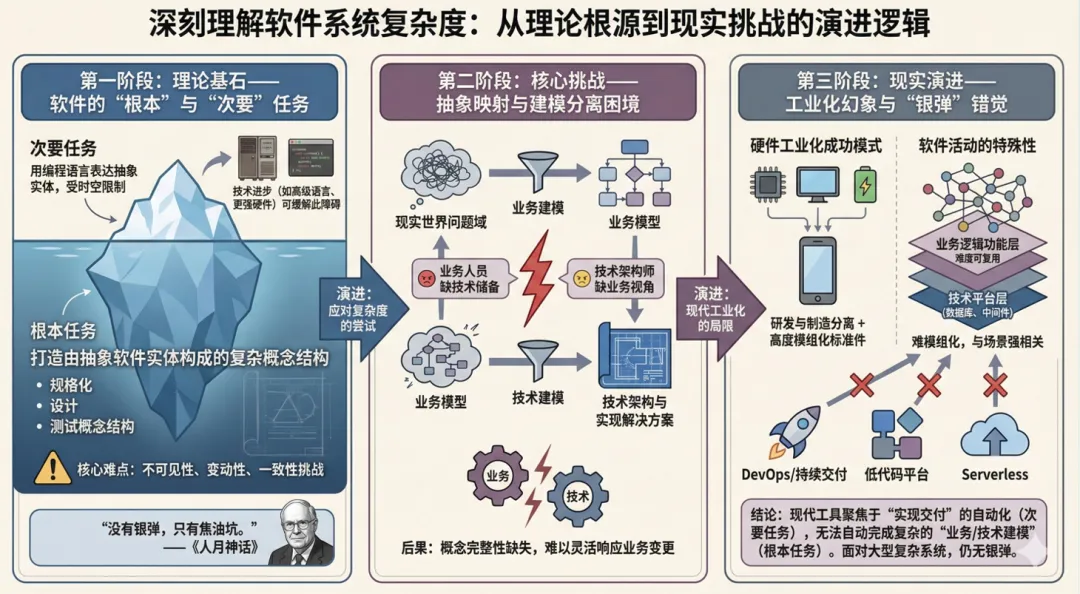 所有软件活动包括根本任务——打造由抽象软件实体构成的复杂概念结构,次要任务 ——使用编程语言表达这些抽象实体,在空间和时间限制内将它们映射成机器语言。