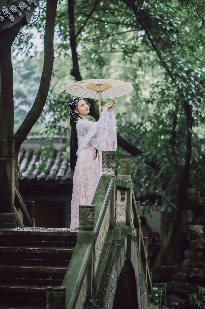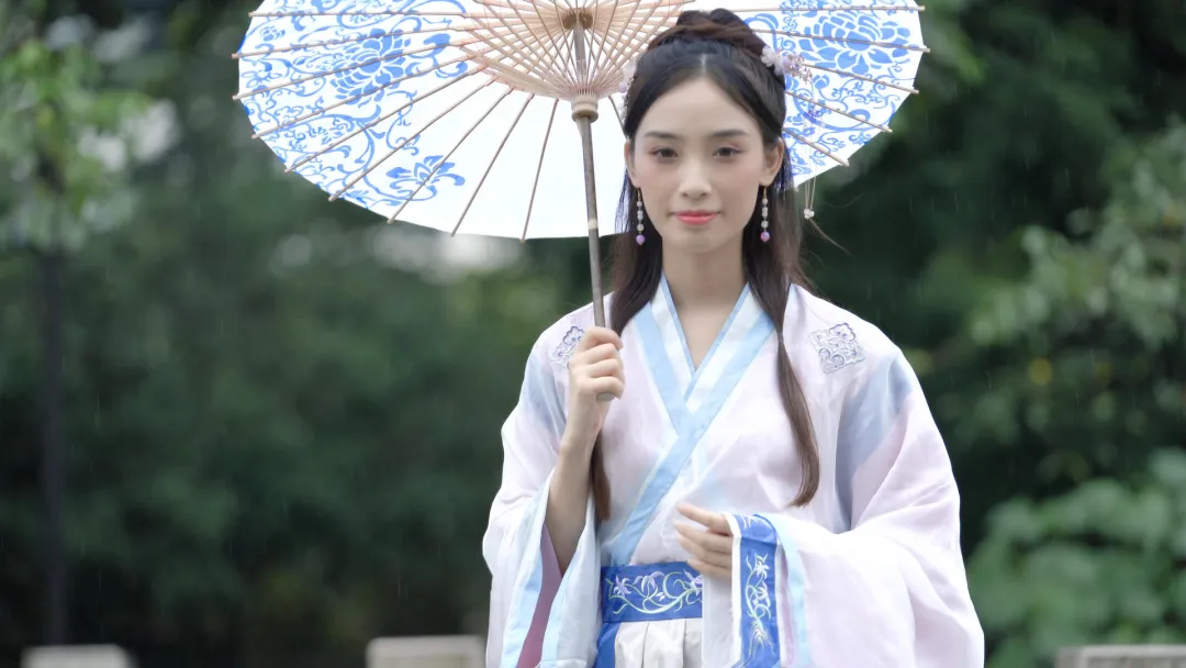 指令:”一位身着汉服的女子在江南水乡撑油纸伞,细雨蒙蒙中回眸浅笑”