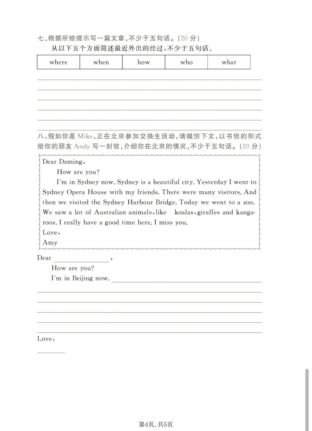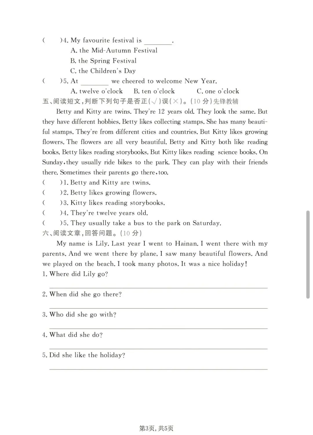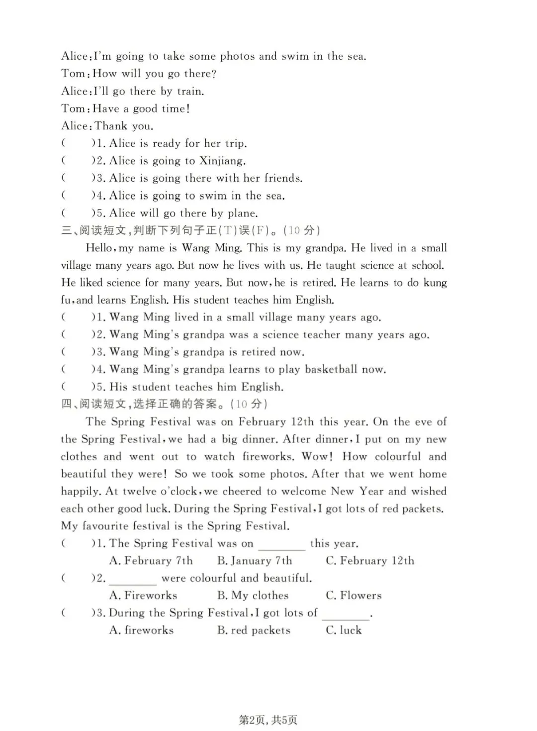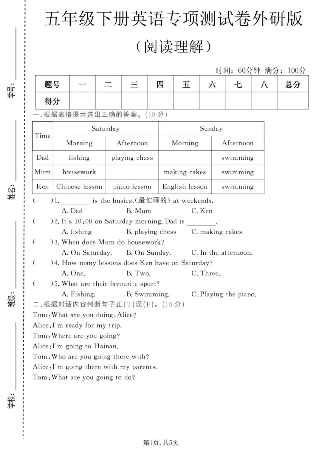 五年级下册英语外研版阅读理解专项测试(电子版可打印附答案)