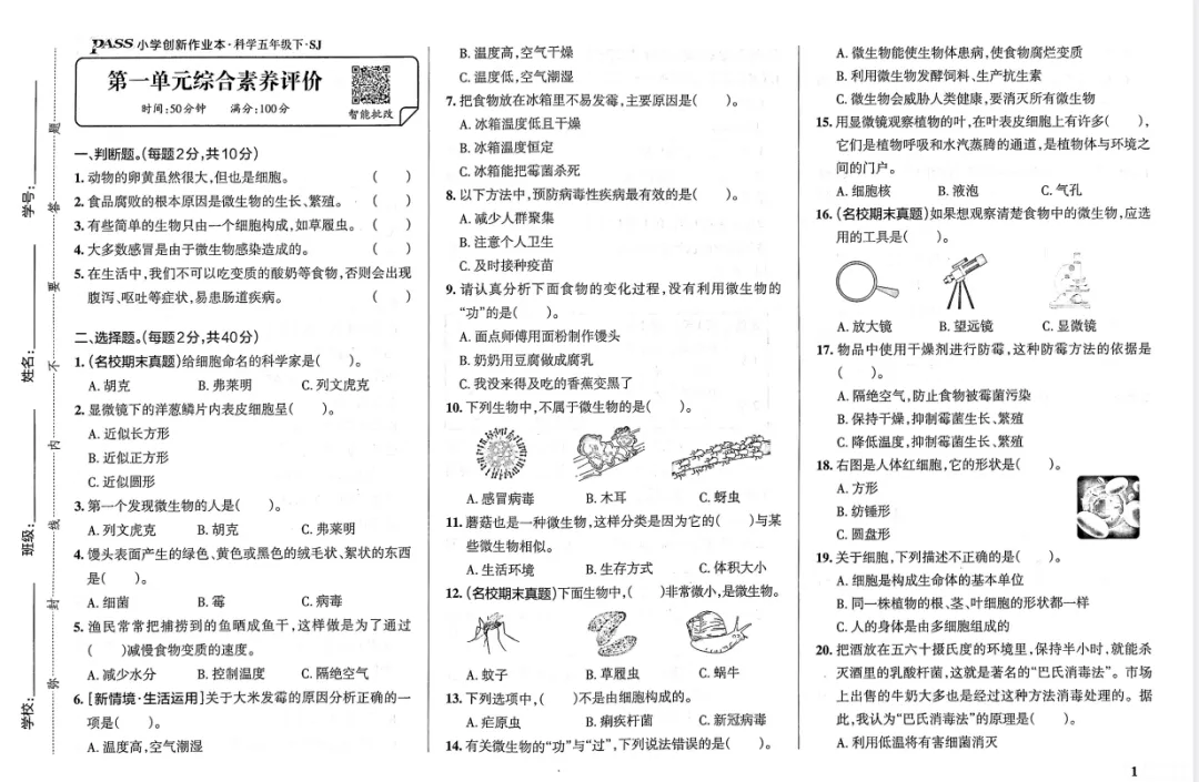 【可下载】2026年春新教科苏教版科学五年级下册第一单元综合素养卷
