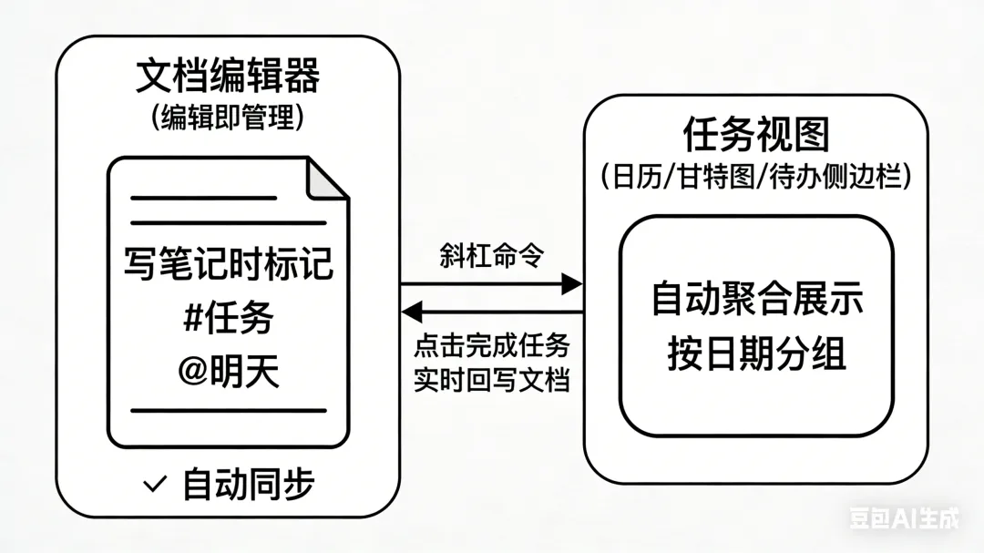 任务助手始终坚持无侵入式的设计理念——文档即任务,标记即管理。斜杠命令让这一理念更加完美地落地: