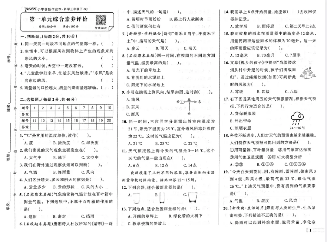 【可下载】2026年春新苏教版科学三年级下册第一单元综合素养卷