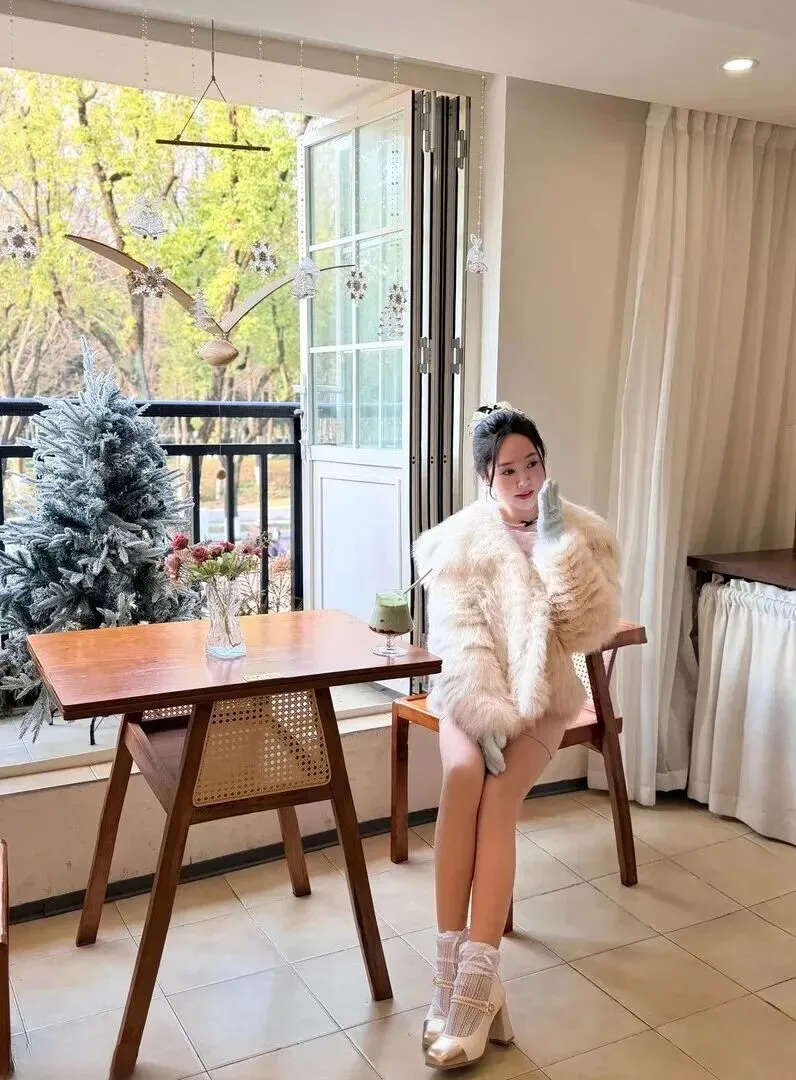圣诞节少不了拍照发朋友圈!第六套用米白色皮草外套搭配浅色内搭,头上加上白皙的蕾丝发箍,甜度刚刚好。对着镜子自拍,背景是满满的圣诞元素,照片拍出来肯定会得到很多的赞。