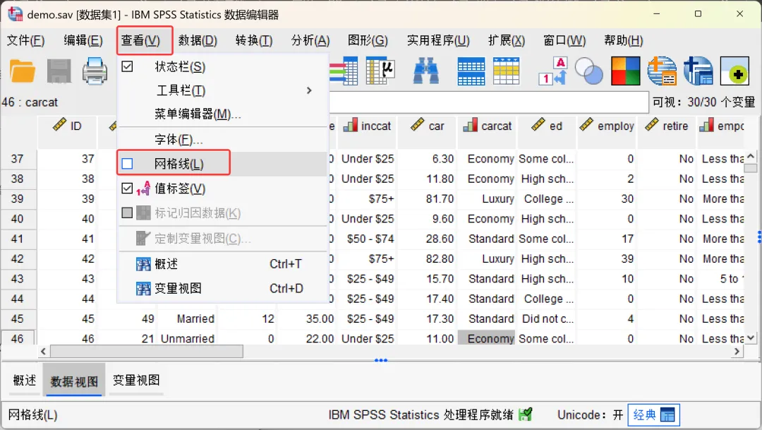 SPSS数据编辑器顶部菜单栏中的「查看」菜单提供了以下3种显示选项: