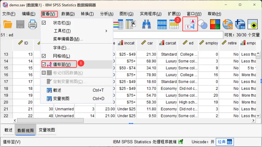 点击顶部菜单栏的【查看→值标签】(也可以点击工具栏上的值标签图标按钮),勾选该选项将会显示标签(如,男/女),取消勾选该选项将会显示原始值(如,1/2)。
