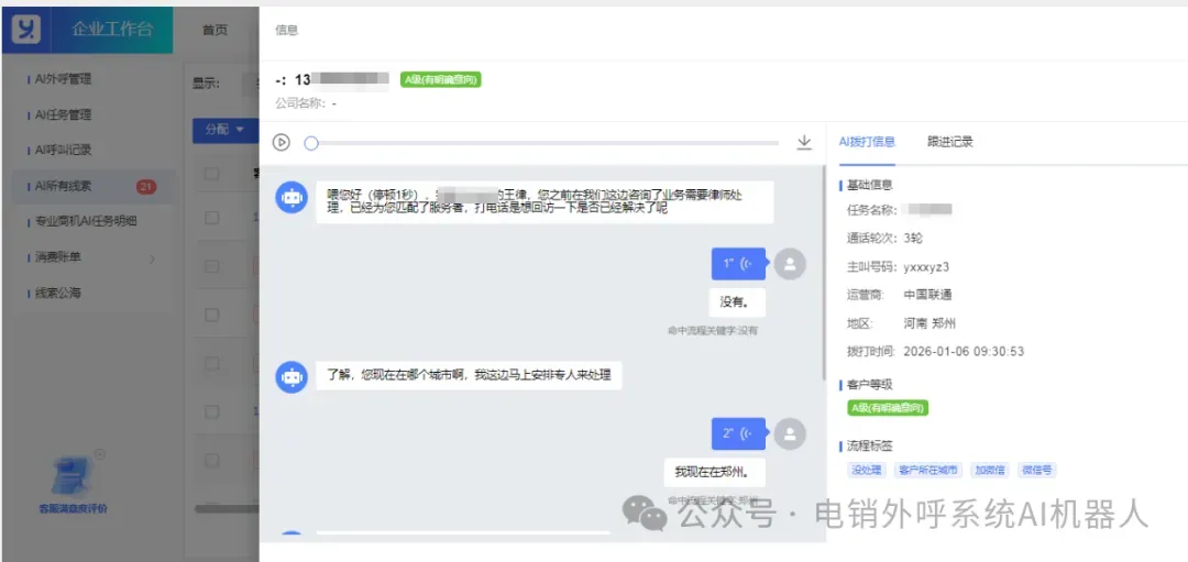 ai电话外呼机器人帮助企业自动拨打电话,每天可以拨打3000通电话,替代人工完成繁琐,重复的筛选工作,筛选出意向客户,直接推送到微信上,解放电销人员,提高工作效率