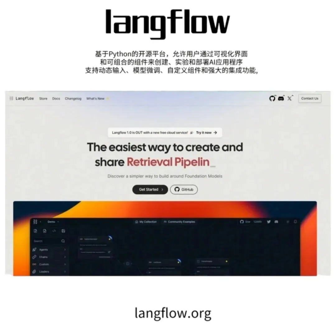 最后一个,给想进阶的朋友。基于Python的开源平台,Langflow像搭积木一样,你可以把各种模型、API拼在一起,捏一个独一无二的AI应用。可玩性极高,适合真的想折腾的人。