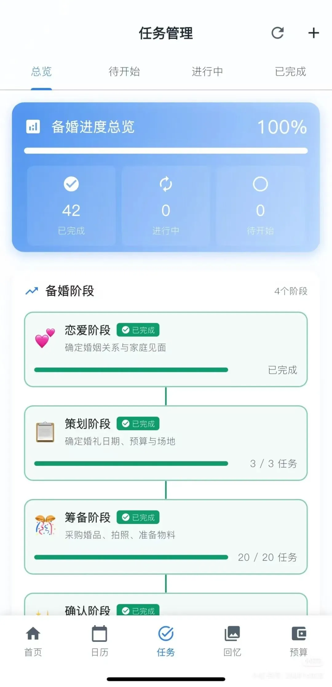 《婚启》主打情侣协同功能,双方账户互联,任务分工清晰,共用一套预算和亲友名单,进度实时同步.