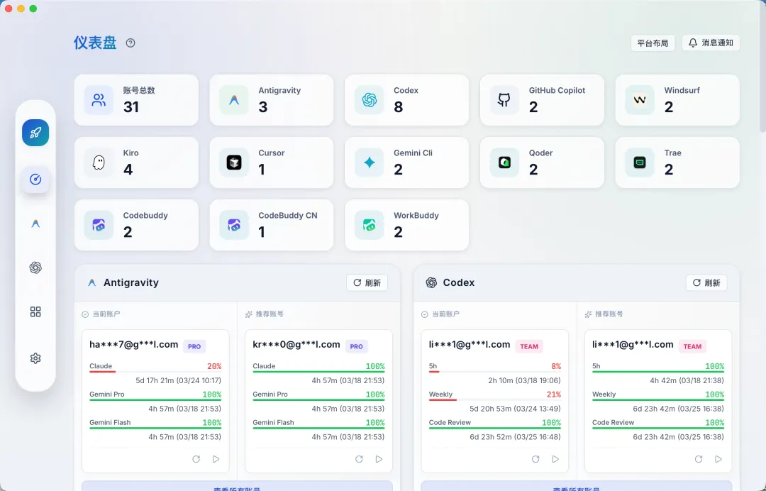 你可以在同一个界面里看账号状态、剩余额度和重置时间,不用来回切换不同 IDE 去查。