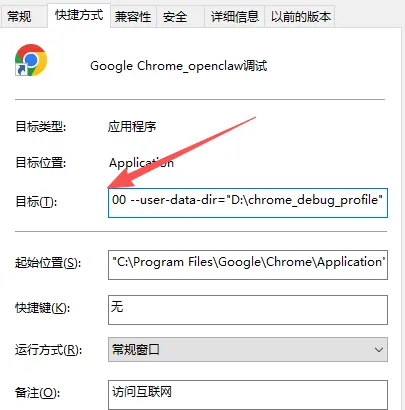 openclaw操作chrome浏览器,调试端口进行建立连接通信来操作,所以我们先在本机里先配置好远程调试端口,方法是右键chrome桌面快捷方式 ,浏览器的启动端口,在目标位置设置好调试端口和用户数据目录。如下图
