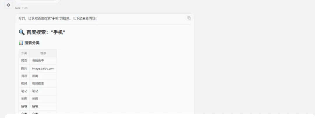 我们做个测试,在对话里告诉他,让他去百度里搜索下关键词“手机”,把结果进行统计分析告诉我,如图。