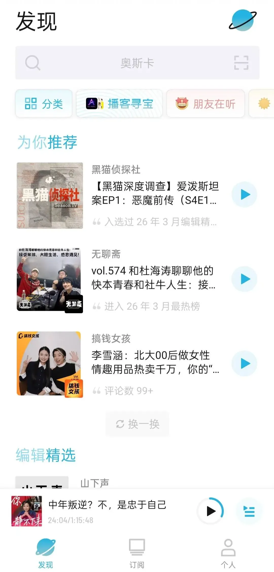 在“小宇宙”的推荐非常对我胃口,首页会根据自己的收听习惯推荐,我经常在“发现”页能逛好长时间,总能挖到宝藏节目。