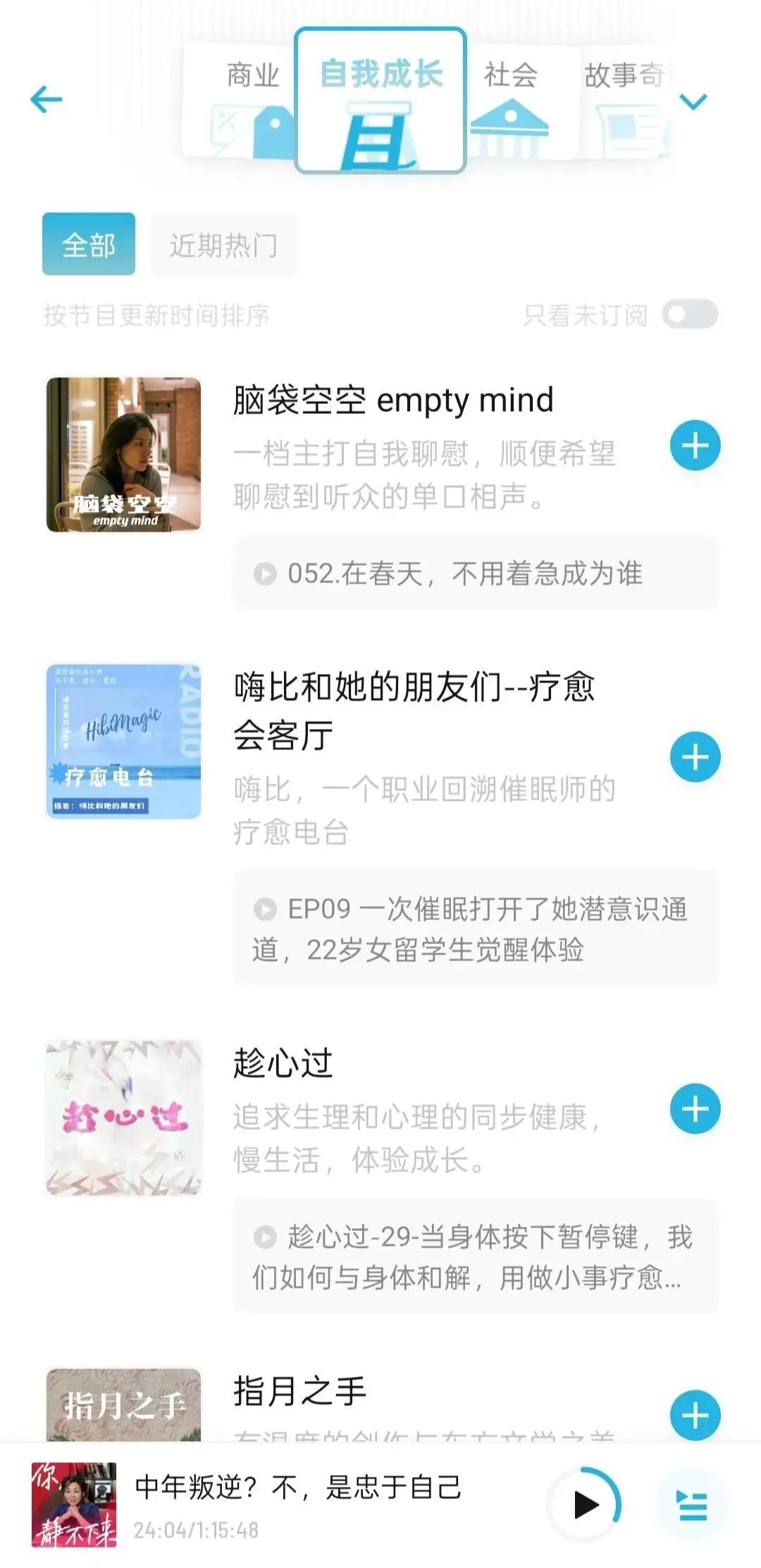 刚开始打开播客不知道听什么的话,可以在发现页按分类查找,比如商业、自我成长、社会、人文等板块,轻松找到想听的内容。