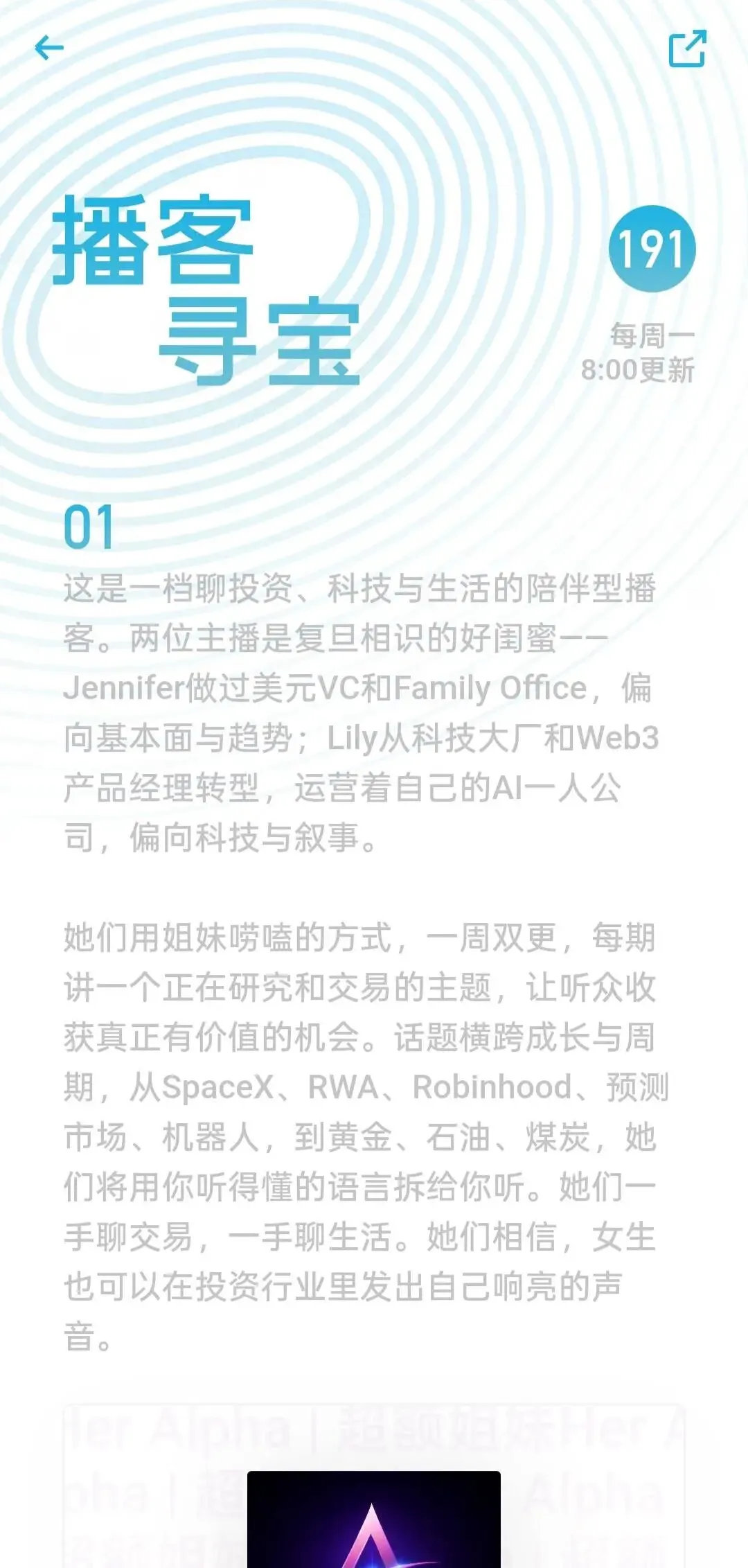 每周一8:00会在发现页更新播客寻宝,每次推荐5期,还会带有简介。现在已经更到191期了,都可以去挑选自己感兴趣的。
